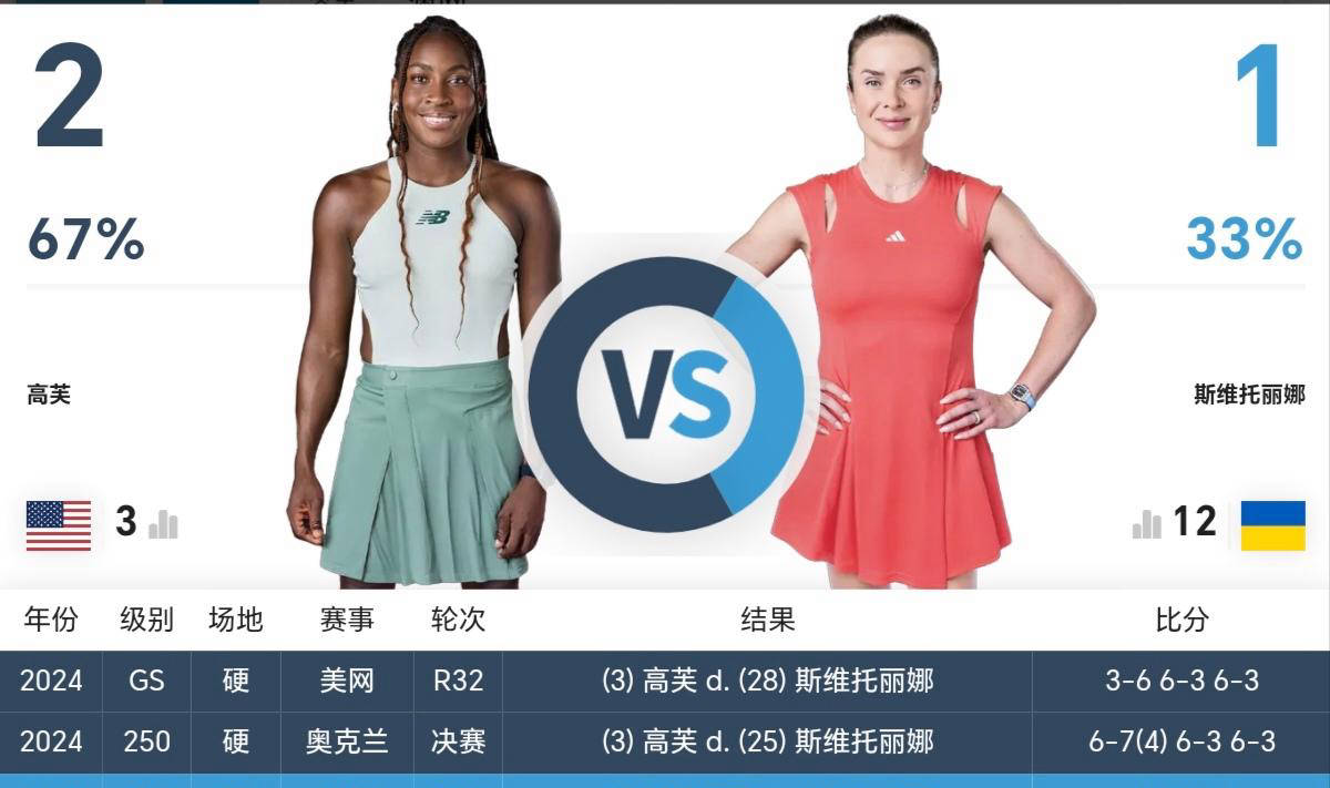 高芙过去一个赛季末期表现起伏明显,成绩中规中矩,很多球迷认为她在夺得法网冠军后缺少了进取心。新赛季开启,高芙带着东山再起的期待来到澳网,作为3号种子,她上一轮经过鏖战三盘艰难击败捷克名将穆霍娃进入八强。此番面对状态火热的12号种子斯维托丽娜,后者此前刚获得一站巡回赛冠军,且在澳网保持强劲势头,两人此前交锋2次各胜一场,高芙稍占心理优势。